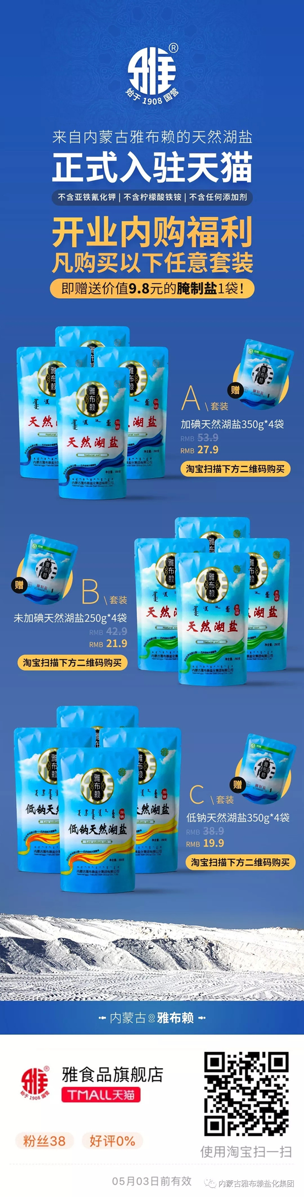 电商公司通过京东的层层严格审核,雅盐天猫旗舰店于4月1日隆重开业。自此,雅盐食用盐、洗涤盐系列8个单品全部上线销售,分别为:大青盐(320g)、低钠天然湖盐(350g)、未加碘天然湖盐(250g)、天然湖盐(350g)、腌制盐(400g)、精制盐(400g、2500g)、果蔬洗涤盐(320g)。 现在,消费者只需在淘宝输入“雅布赖盐”、“雅食品旗舰店”或使用淘宝扫描上图二维码,即可找到由华体会 – 华体会平台 – 华体会官网