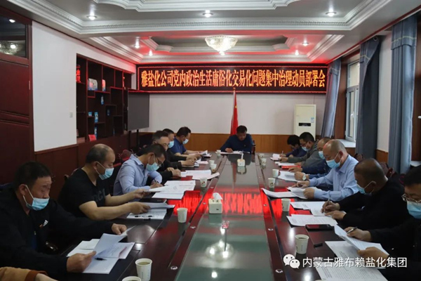 为深入落实自治区党委、盟委、旗委关于开展党内政治生活庸俗化交易化问题集中治理工作部署要求。4月20日,雅盐化公司召开党内政治生活庸俗化交易化问题集中治理动员部署会,集团公司党委书记、董事长李奎锦主持会议并讲话,集团公司党委委员、中层管理人员参加会议。 会上,传达学习了习近平总书记在参加十三届全国人大五次会议内蒙古代表团审议时的重要讲话精神和旗委《集中治理党内政治生活庸俗化交易化问题的实施方案》等内容,通报了党内政治生活庸俗化交易化问题清单和查处要求,对集团公司集中治理工作作了安排部署。
